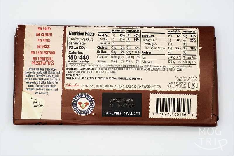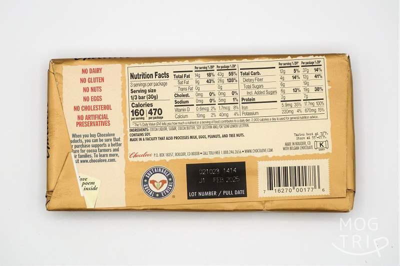 どんなメーカーなのかを「公式HP」で確認してみました。プロのテイスターでもある〝ティモシー・モーリー(Timothy Moley)〟が、1995年にチョコラブを設立。オーガニック・フェアトレードなど社会的に責任のある方法で調達された原材料を追求し、砂糖はヨーロッパ産の〝てんさい糖〟を、オーガニックチョコレートには〝きび砂糖〟を使用。最高品質のチョコレートを、手頃な価格で提供することに尽くしています。
