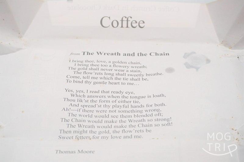 INGREDIENTSDARK CHOCOLATE(COCOA LIQUOR、SUGUR、COCOA BUTTER、SOY LECITHIN AND/OR SUNFLOWER LECITHIN、VANILLA)、COFFEE