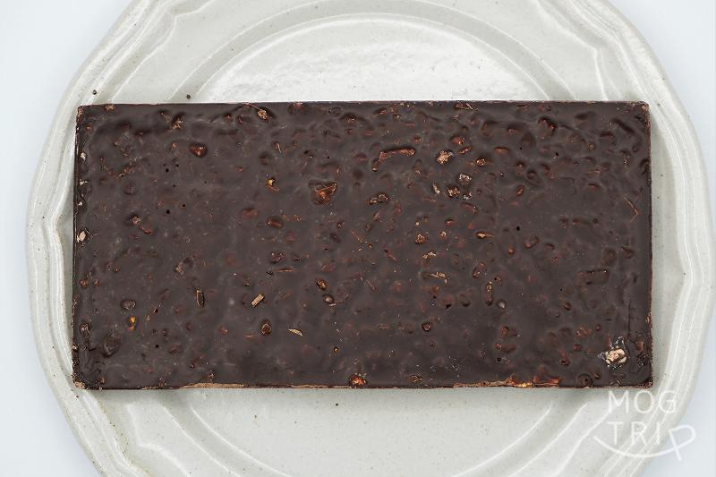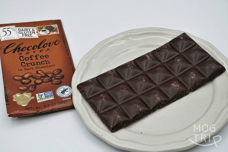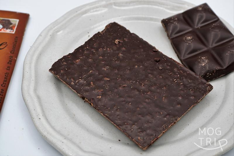 カカオ55%の「コーヒークランチ入りダークチョコレート」も、負けず劣らずおいしいチョコ。コーヒー味のチョコレートではなく、焙煎されたコーヒー豆が全体に散りばめられたチョコレート。細かく砕かれたコーヒー豆がたっぷり含まれていて、どこを食べてもコーヒーの風味が口いっぱいに広がります。