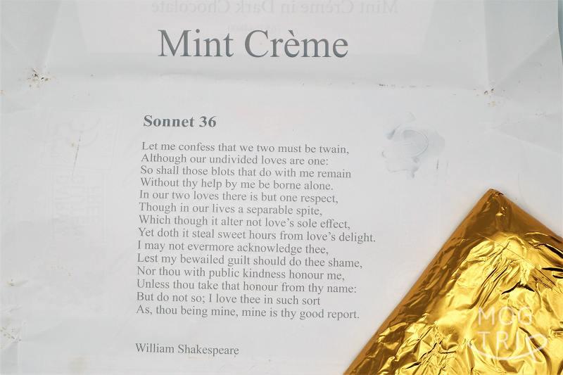 原材料ダークチョコレート(ココアリカー、砂糖、ココアバター、大豆レシチン および/または ひまわりレシチン、バニラ)、フォンダン(サトウキビ, グルコースシロップ, 水)、タピオカシロップカカオバターペパーミントオイル