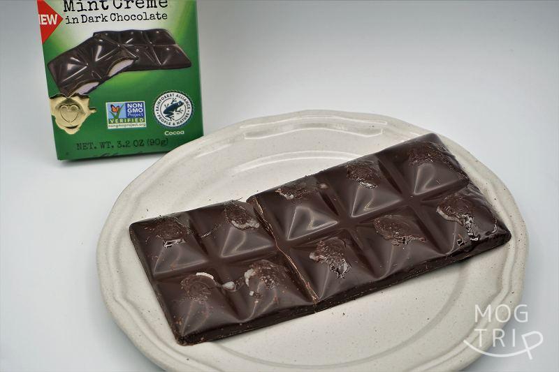 カカオ55%の「ミントクリーム入りダークチョコレート」には、名前のとおり中に白い〝ぺパーミントオイル入り〟のクリームがたっぷり包まれています。チョコの中にミントが加えられている訳ではないので、ペパーミントオイルの風味がストレートに感じられる仕上がりに。しっかりとした甘さと清涼感が、口の中いっぱいに広がります。