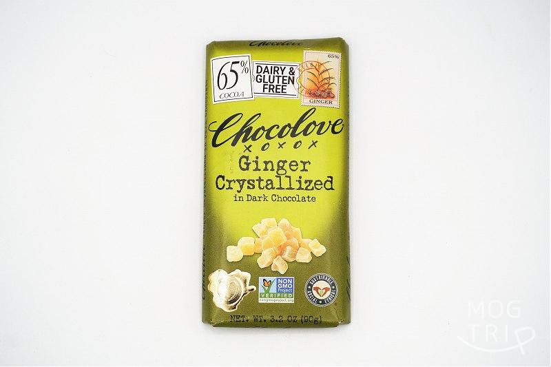 とっても食べやすくておいしいのが、カカオ55%の「砂糖漬けショウガ入りダークチョコレート」。名前のとおり〝砂糖漬けの生姜〟が含まれていて、チョコ一辺倒の味の中に砂糖の甘みと食感が加わってます。