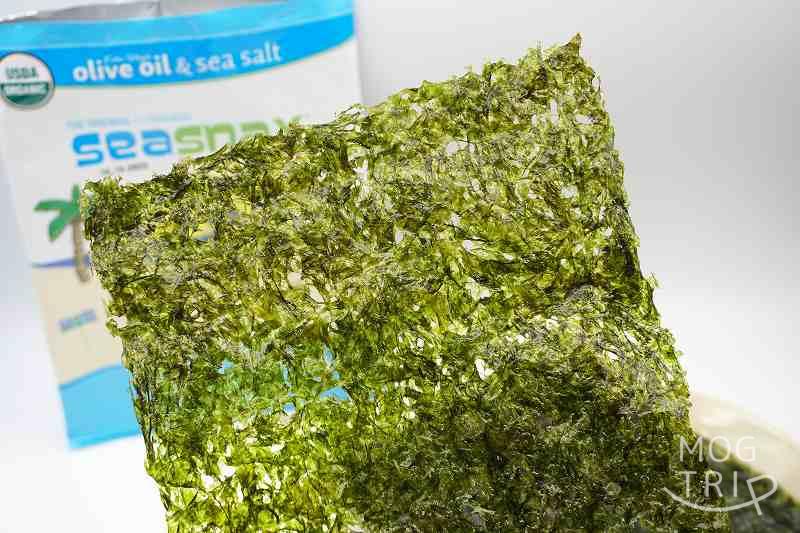 「SeaSnax Sheets(シースナックスシート)」は、とても大きな1枚ものの〝韓国海苔〟。Non-GMO(遺伝子組み換えでない)を掲げていて、その他にも〝ごま・小麦粉・ナッツ・大豆・砂糖など〟は不使用。少量のオリーブオイルのみで焼き上げていて、よりヘルシーに、よりさっぱりと食べられるんです。