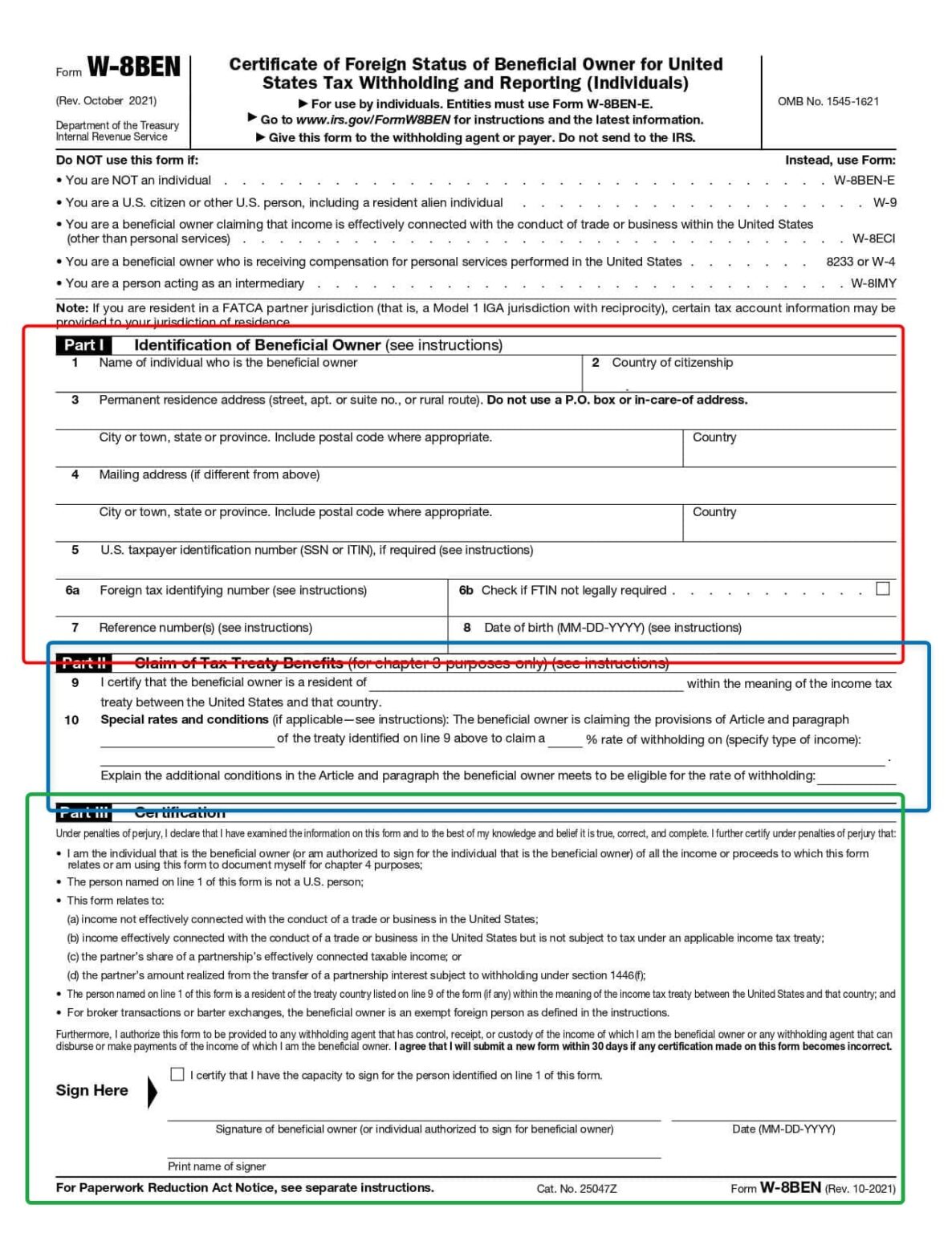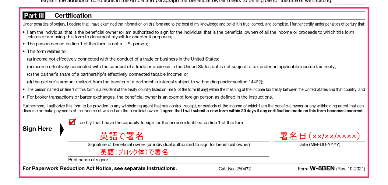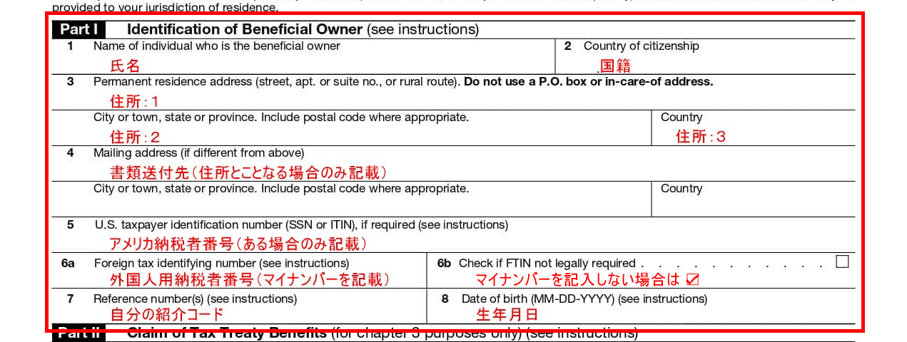 納税者証明(W8-BEN)は、記入パートが3つに分かれています。