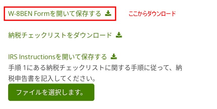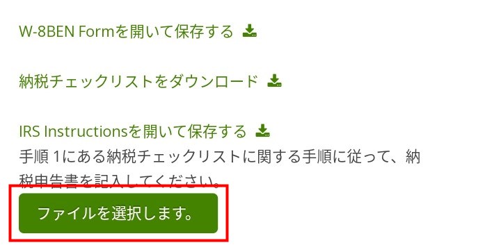 納税者証明(W8-BEN)をダウンロードしたページの すぐ下に【ファイルを選択します】というボタンがあるので、ここに先ほど用意した書類をアップロードしましょう。